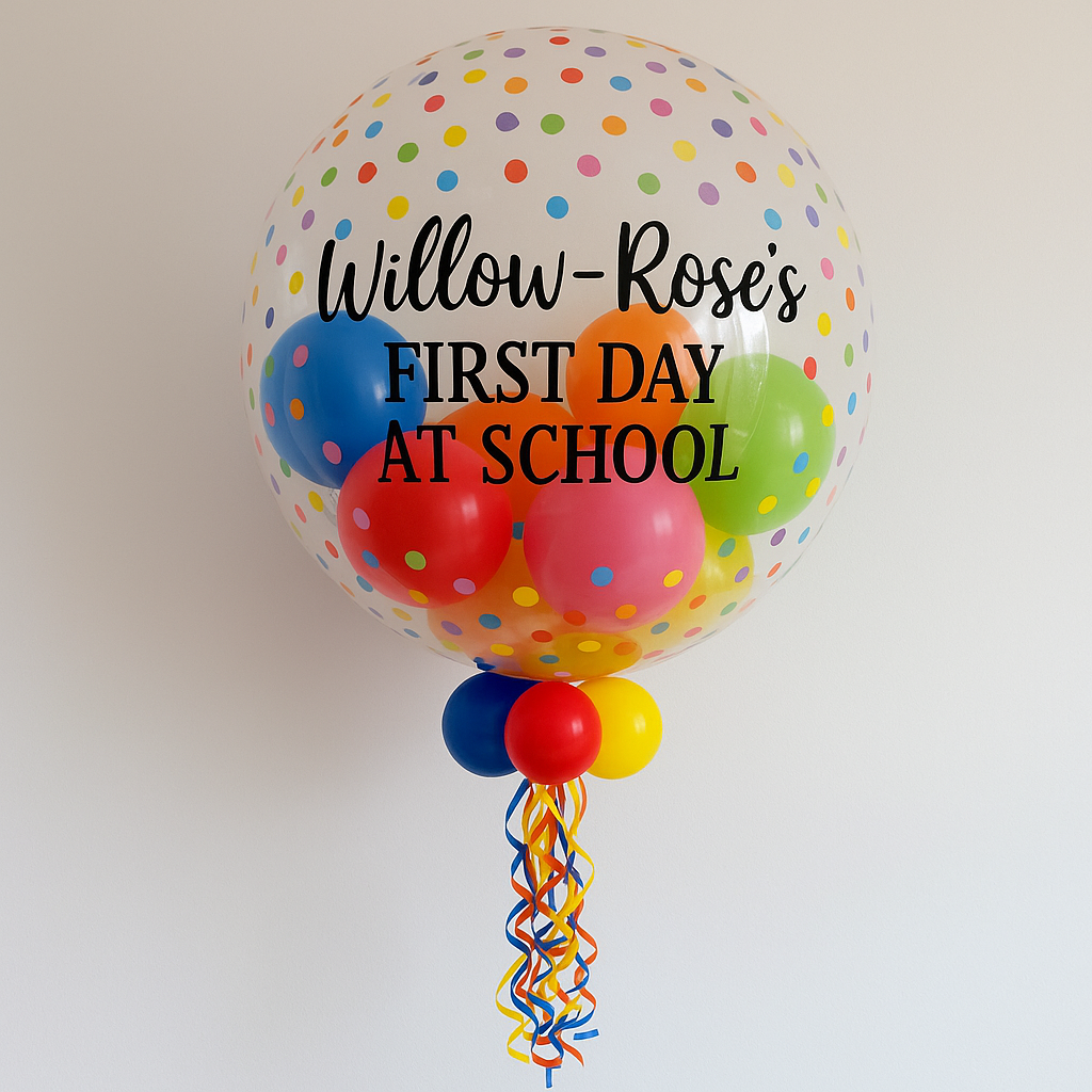 This giant clear balloon is filled with colourful mini balloons and decorated with multi-coloured polka dots, vibrant ribbon tails, and your choice of personalised text (e.g., “Willow-Rose’s First Day at School”). It’s the perfect photo prop for capturing those first-day memories and a wonderful surprise for the morning before school.
