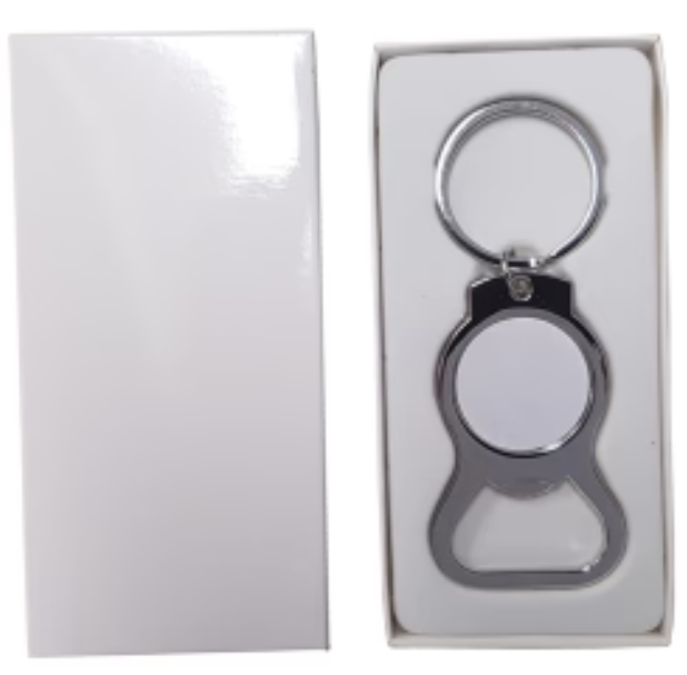 round bottle opener. Keyring measures 9.2cm x 3.4cm. Printable area of insert measures 2.5cm.